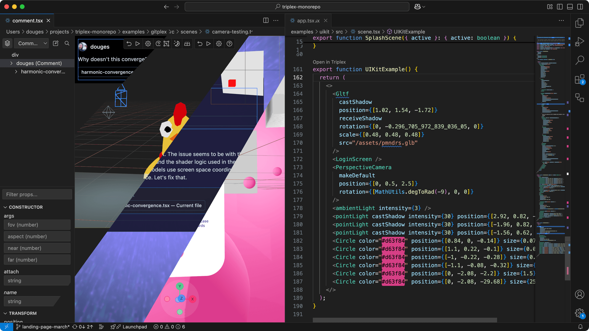 Triplex was originally released as a standalone app promising to eliminate the friction of developing in 3D and lowering the barrier of entry for coders and non-coders alike. Positioning objects, lights, and cameras was never easier thanks to its visual controls and code-sync features. Before you'd jump in-and-out of your code editor and browser to see if the changes to your React component were correct, instead with Triplex you'd just make the change visually or with input controls then save straight back to code.